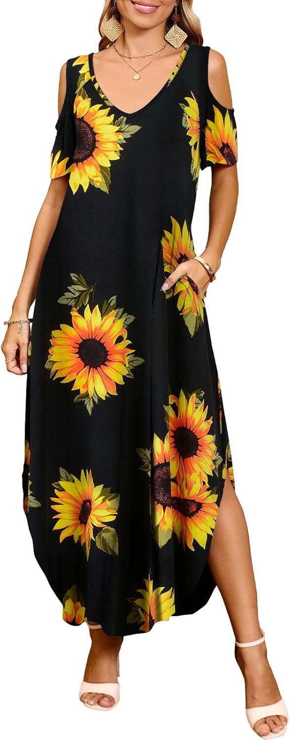 JollieLovin Womens Plus Size Casual Summer Maxi Long Dress Cold Shoulder V Neck Beach Sundresses