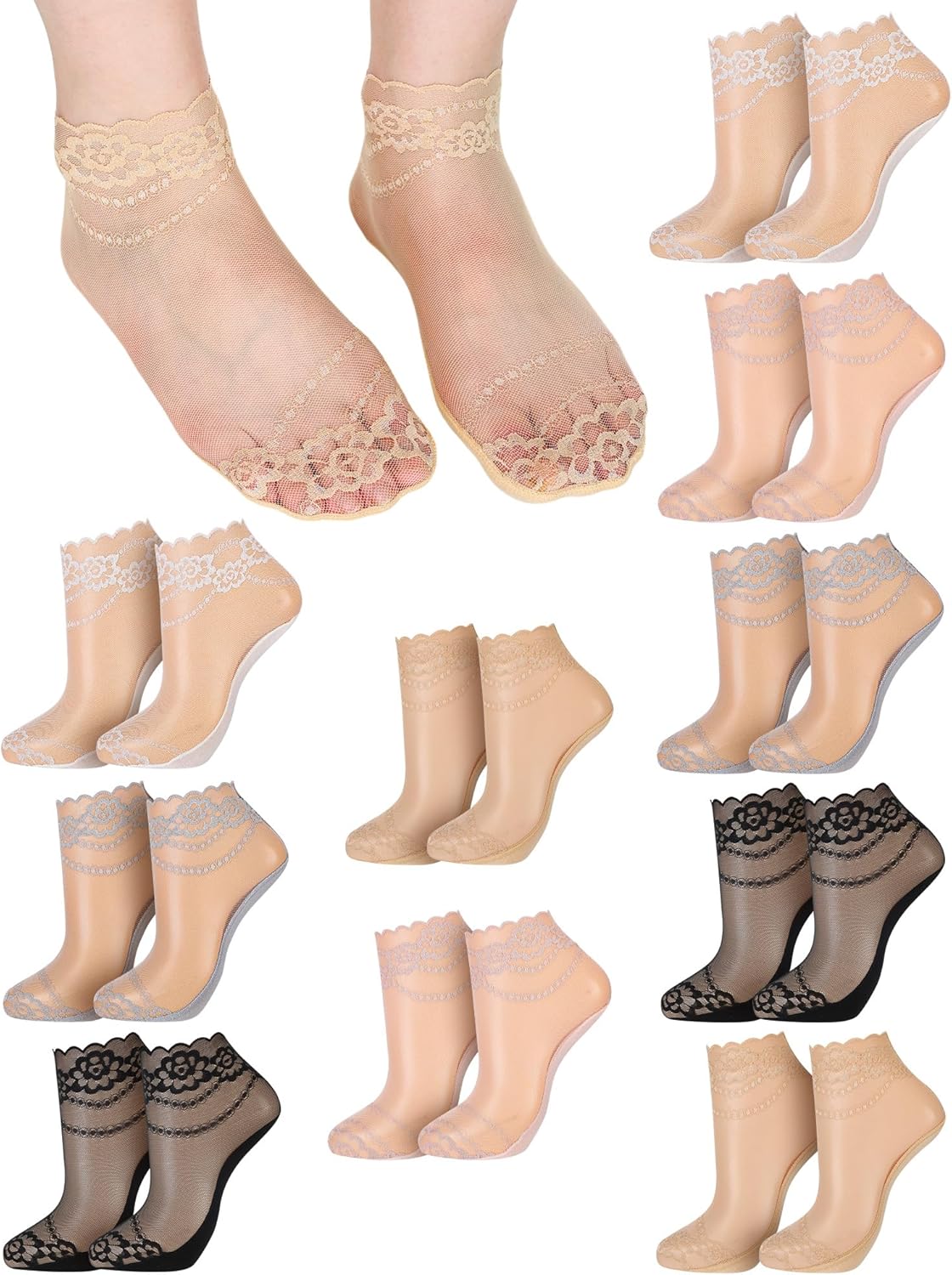 10 Pairs Womens Lace Ankle Socks Non Slip Low Cut and No Show Lace Socks Sets for Loafers Flats