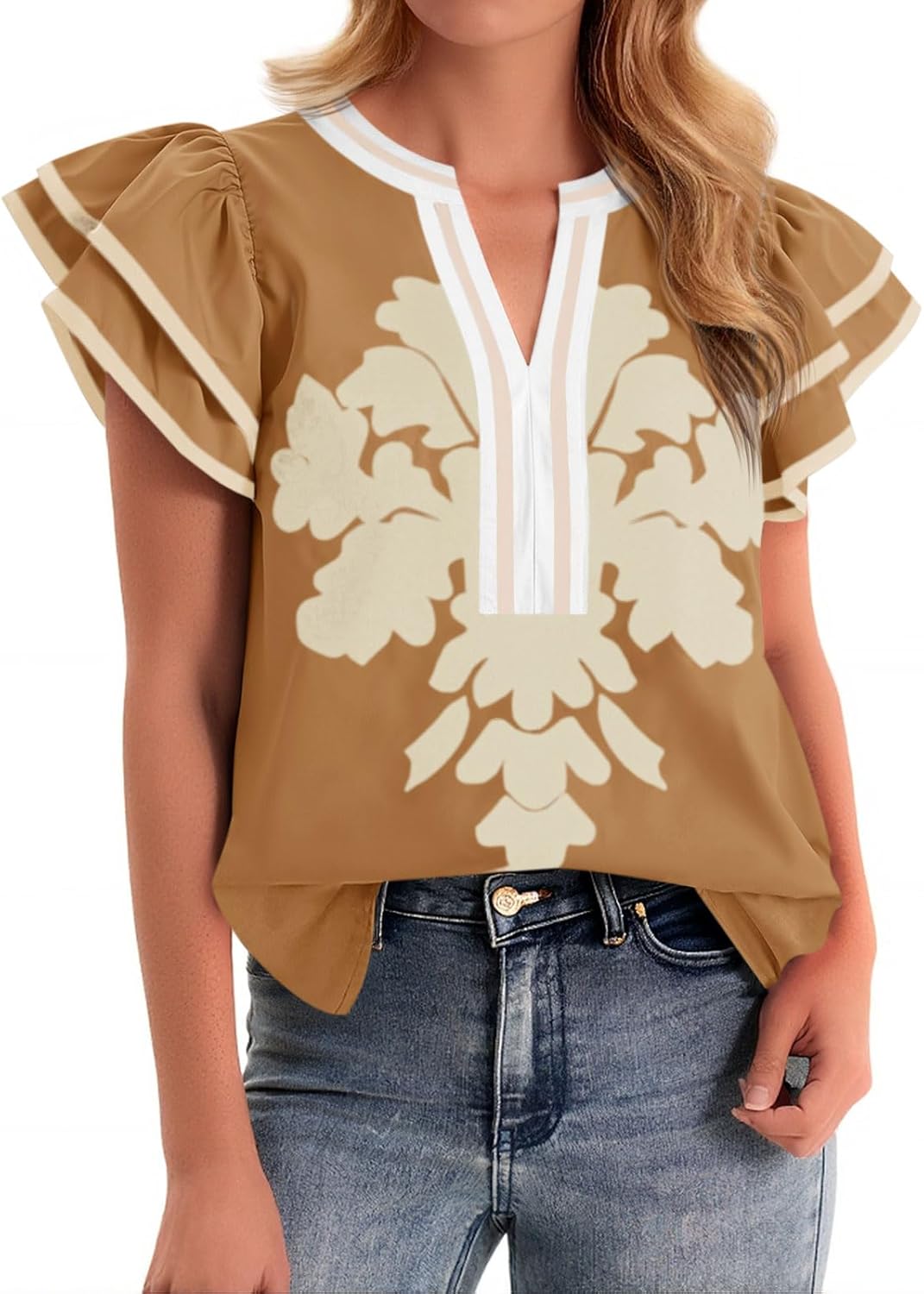 Cicy Bell Womens Ruffle Color Block Blouses Summer Casual V Neck Floral Print Tank Tops Pleated Loose Fit Shirts