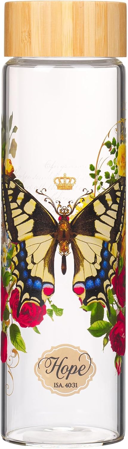 Christian Art Gifts Premium Yellow Butterfly Reusable Glass Water Bottle with Bamboo Twist Cap Lid for Travel and Cold Beverages 22 oz Bottle with Inspirational Scripture for Women - Hope Isaiah 40:31