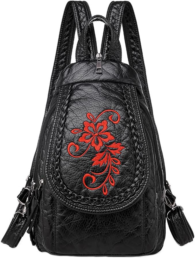 Vintage Embroidered Women Backpacks Soft PU Leather Backpack Purse Small Female Travel Bag High Capacity Black Chest Packs (Red Flower)