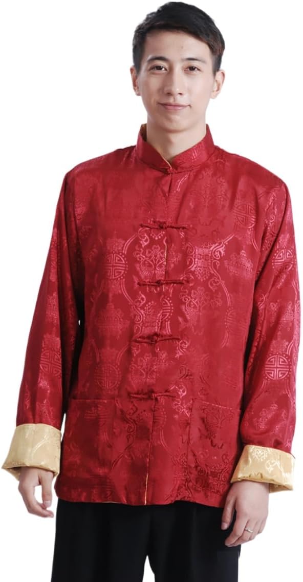 Chinese Tang Style Men's Silk Scarf Shirt, Double-Sided Long Sleeved Tai Chi Suit, Daily Morning Exercise Banquet