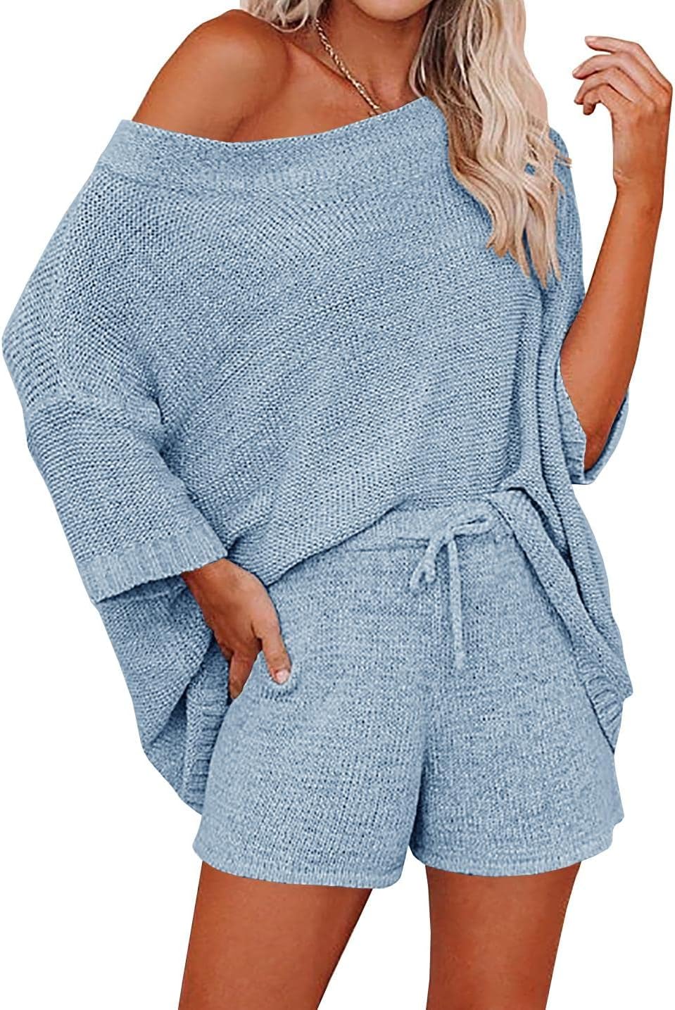 Ermonn Womens 2 Piece Outfits Sweater Sets Off Shoulder Knit Tops Waist Short Suits Casual Pajama Set