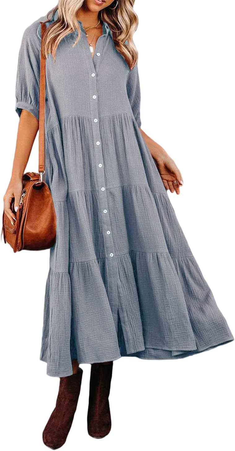 R.Vivimos Women's Summer Cotton Half Sleeves Button Down Casual Loose Slit Midi Dress with Pockets