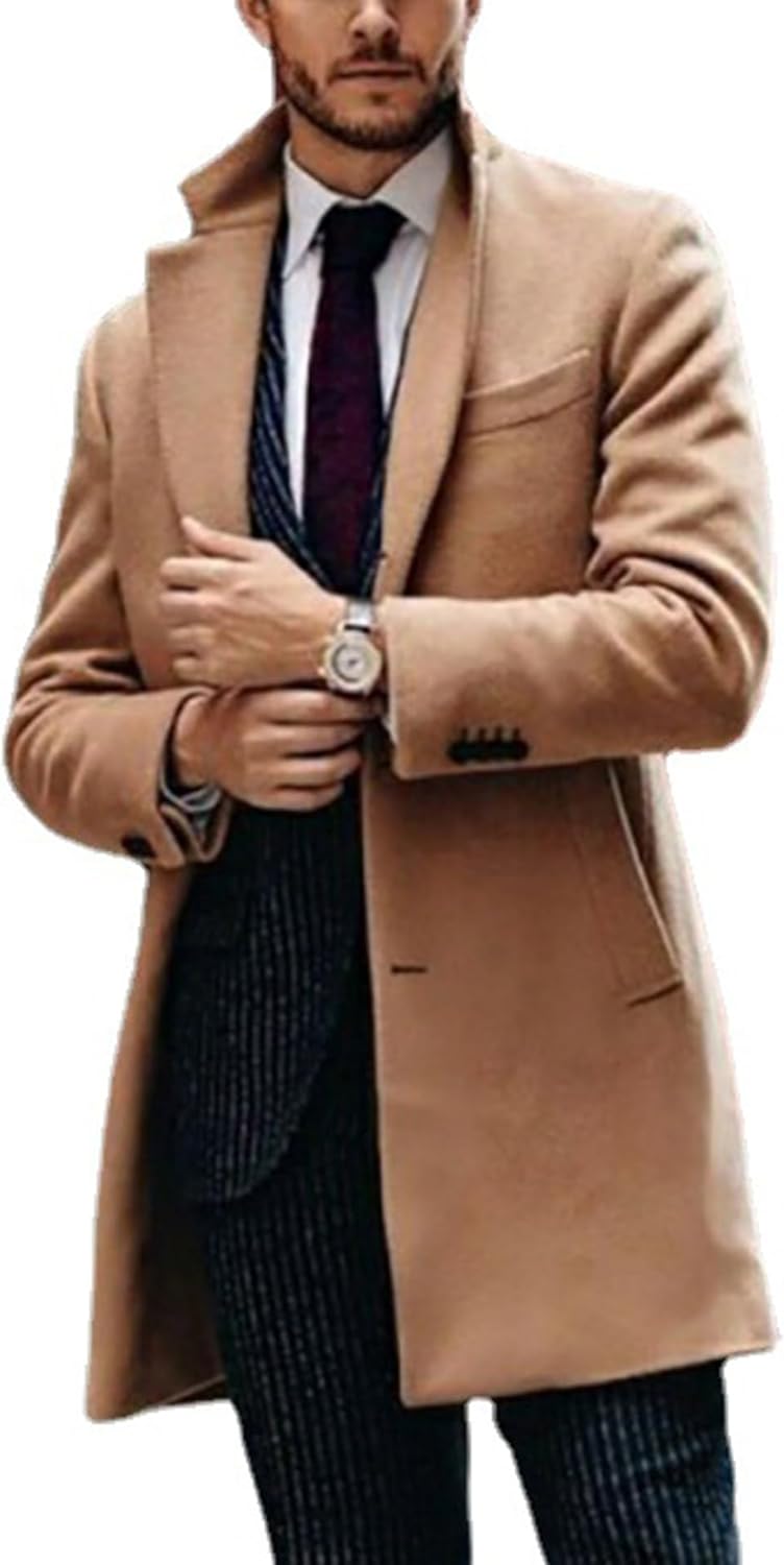 SOMTHRON Men's Trench Coat Slim Fit Single Breasted Notched Lapel Mid Long Jacket Pea Coat Winter Business Overcoat