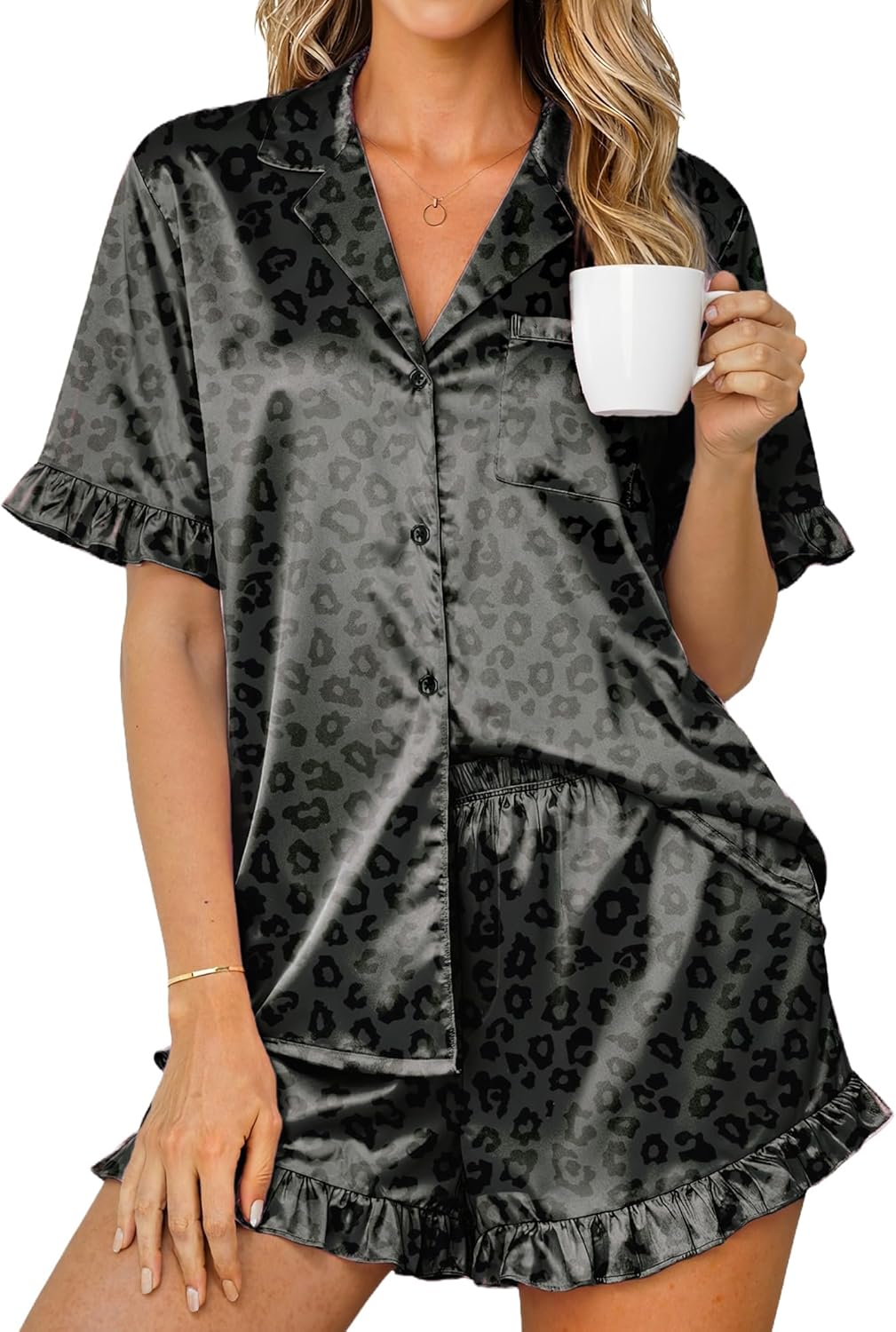 Ekouaer Womens Satin Pajamas Cute Ruffle Sleeve Printed Sleepwear Button Down Silk Pjs Set