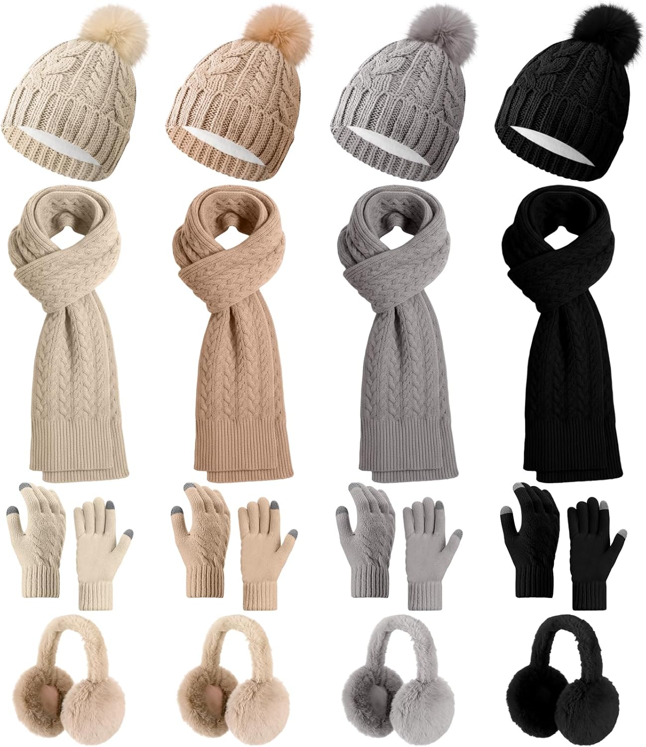 16 Pcs Women Hat Scarf Gloves Ear Muffs Set Winter Knitted Pom Beanie Hats Scarf Touch Screen Gloves for Men Adult Homeless