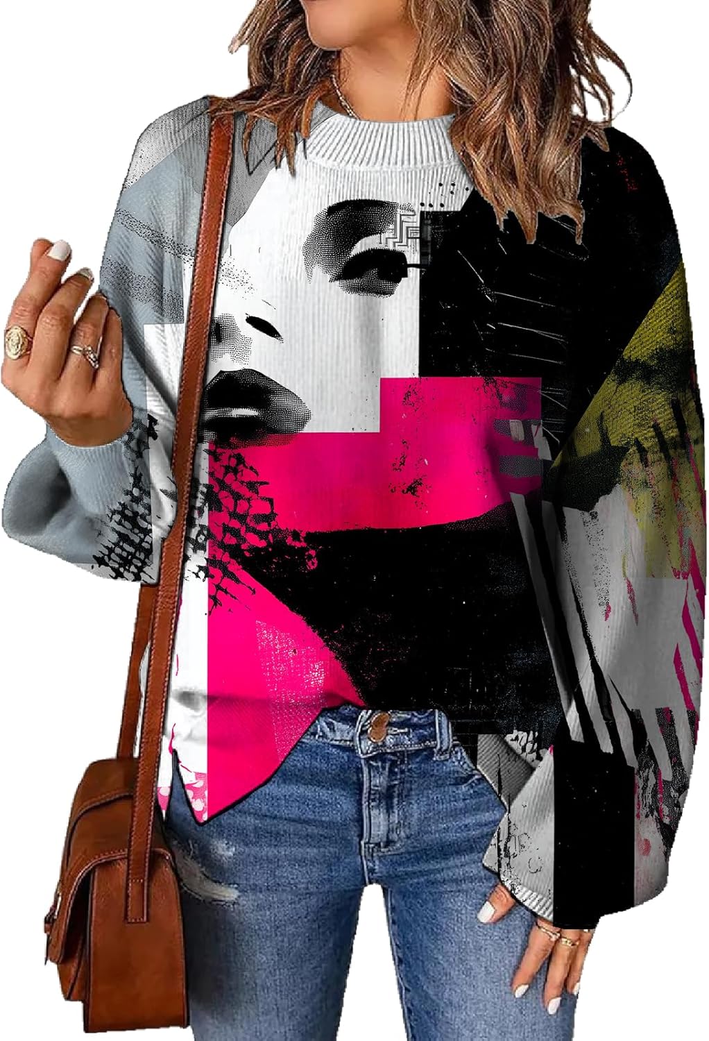 Womens Sweater Fashion Printed Lantern Sleeve Crewneck Pullover Tops Plus Size Warm Soft Knitted Fall Jumpers