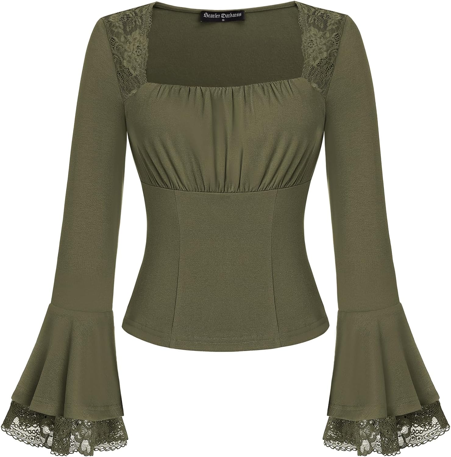 Scarlet Darkness Long Sleeve Tops for Women Square Neck Shirts Fitted Fall Blouse Goth Victorian Tees Going Out Clothes