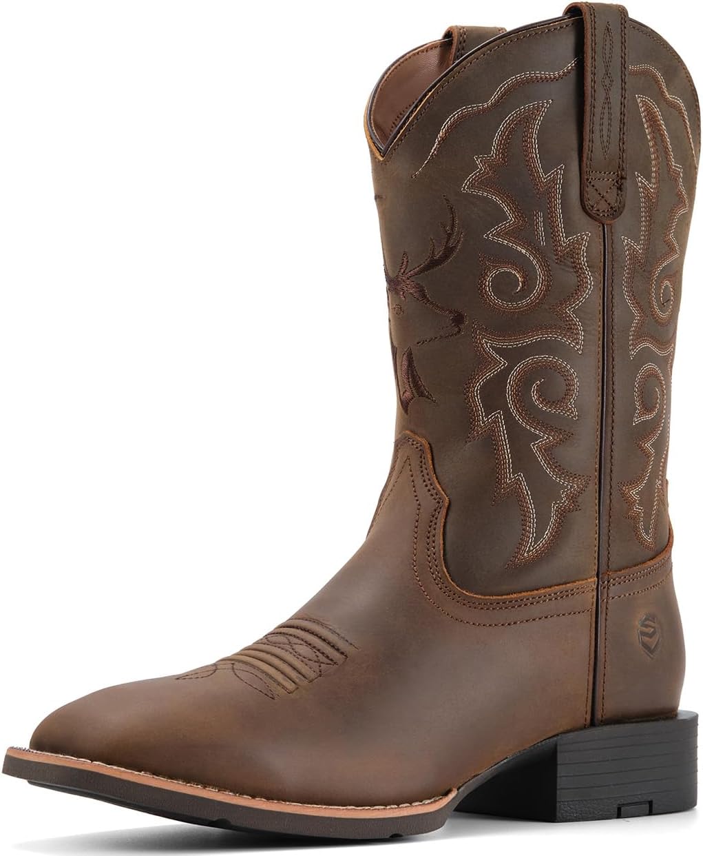 SUREWAY Cowboy Boots For Men - Square Toe Western Boot,Oil/Slip Resistant,Durable Fashionable Classic Pull on 10 Inch Wellington Boots - Leather
