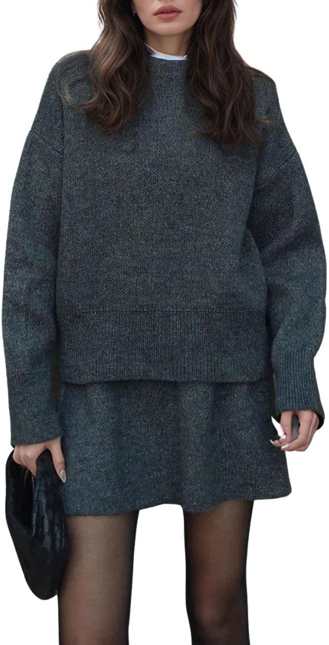 CHARTOU Women Sweater Skirt Sets 2 Pieces Outfits Loose Fit Pullover Sweater Knitted Mini Skirt