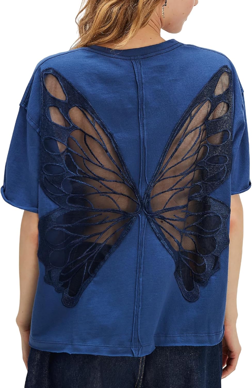 Women Sheer Butterfly T Shirt Short Sleeve Cut Out Back Tee Top Embroidered Oversized Tee Shirts Streetwear