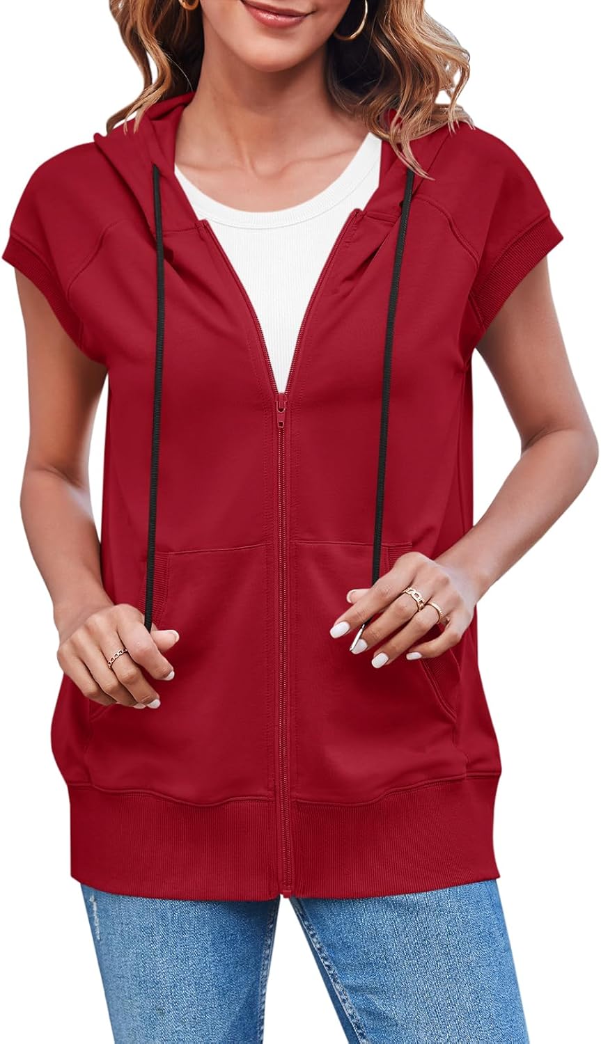 Fisoew Women's Sleeveless Zip Up Hoodies Casual Loose Fit Drawstring Sweatshirts Lightweight Jackets Vest with Pockets