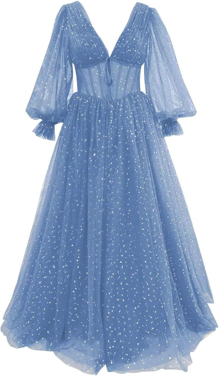 GARDOM Sparkly Starry Tulle Prom Dresses with Sleeves for Teens Long Puffy Sleeve Ball Gown Formal Evening Gown Pockets
