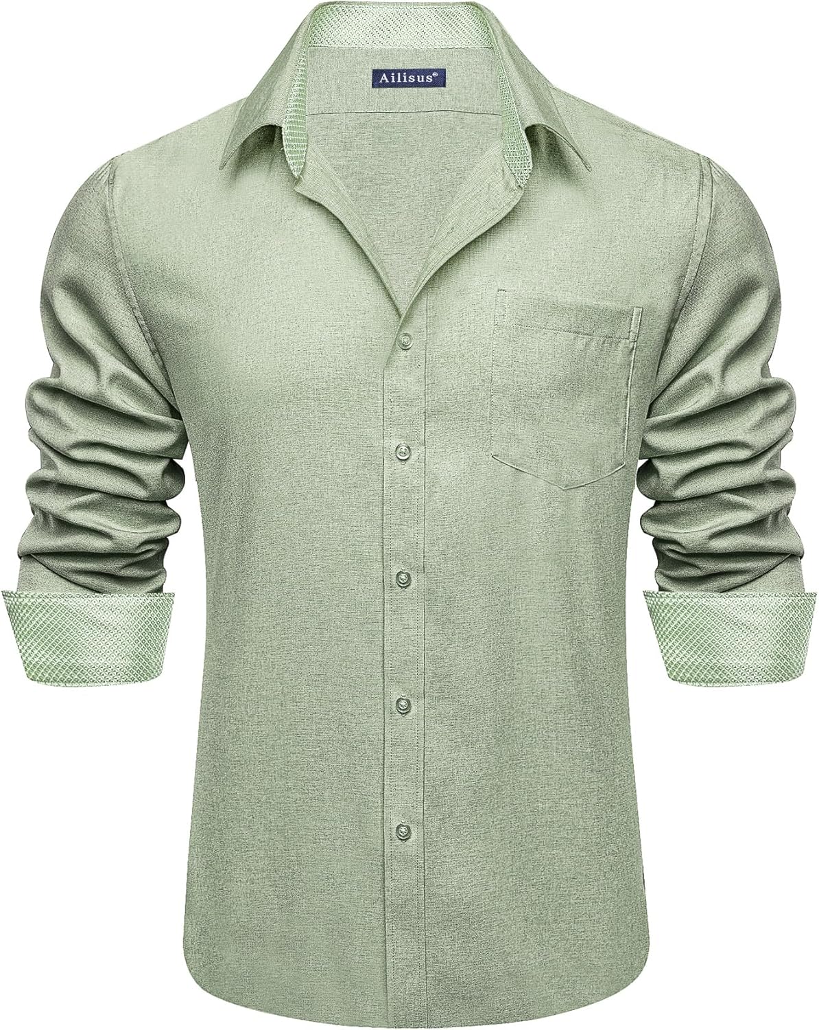 Mens Linen Shirts Casual Long Sleeve Button Down Shirt Untucked Regular Fit Contrast Collar Dress Shirt with Pocket