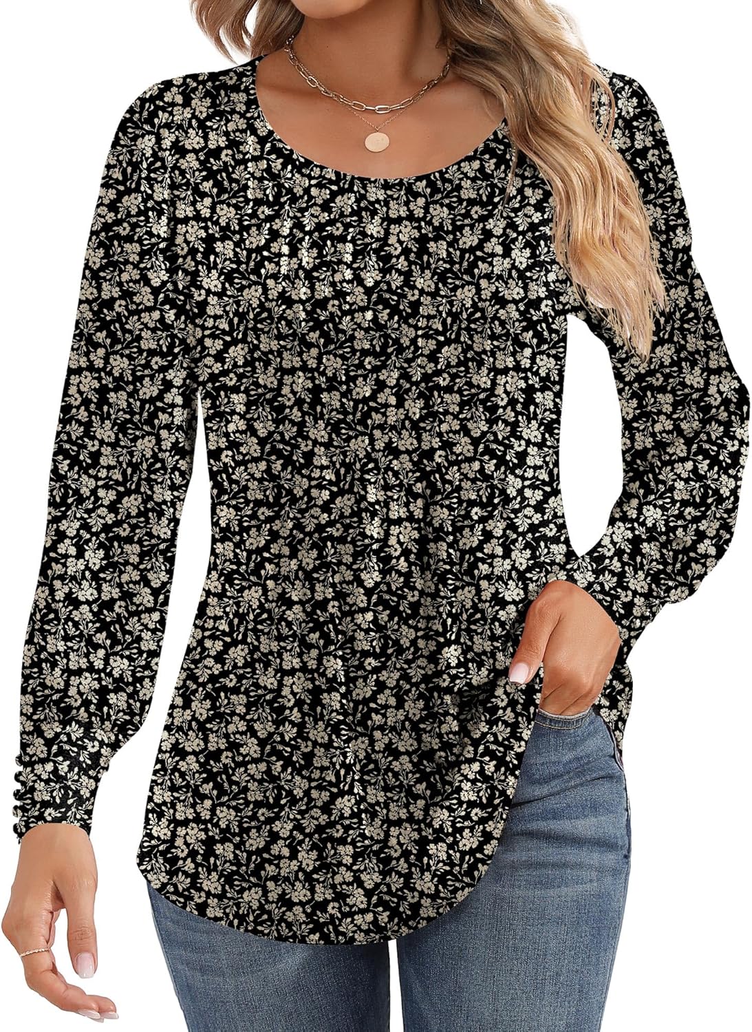 Ficerd Women's Puff Long Sleeve Tunic Tops Pleated Crew Neck Blouses Dressy Casual Loose Fit Fall and Winter Shirts
