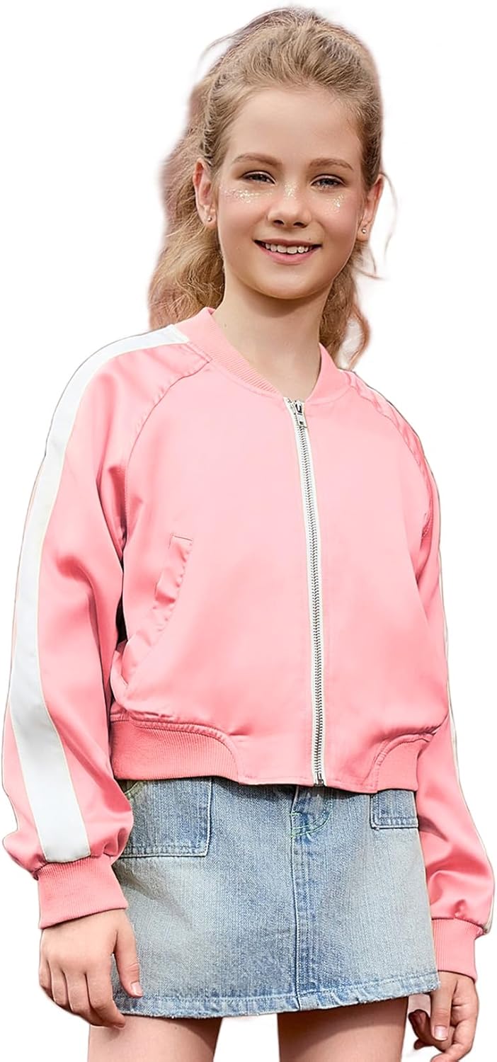 Perfashion Satin Bomber Jacket for Girls Zip Up Varsity Cropped Coat Sparkly Windbreaker with Pockets 4-13Y