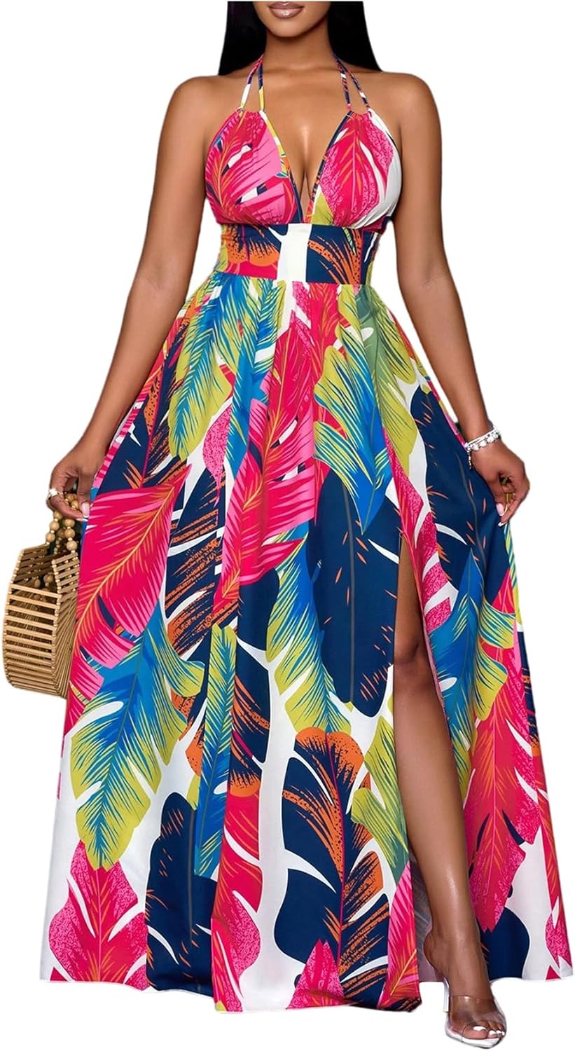 Floerns Women's Summer Long Dress Tropical Halter Neck Slit Hem Beach A Line Dresses