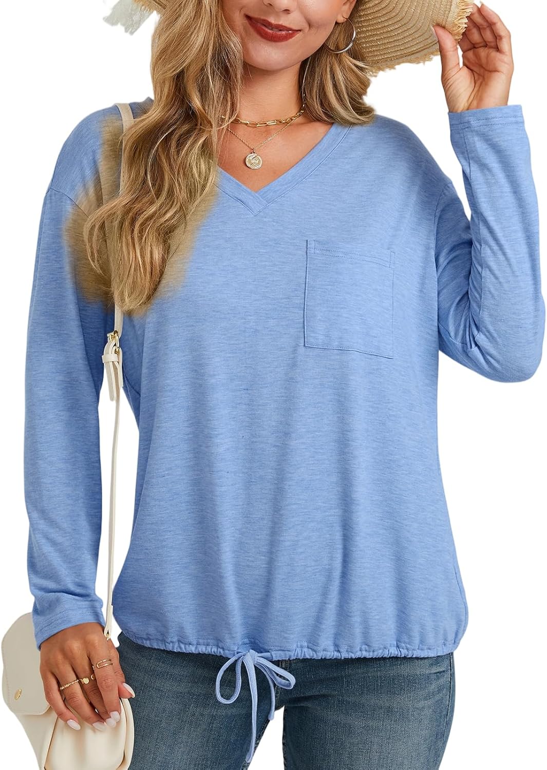 V Neck Long Sleeve T Shirts for Women Basic Drawstring Blouse Tees Elastic Hem Spring Fall Tunic Top 2026 Trendy