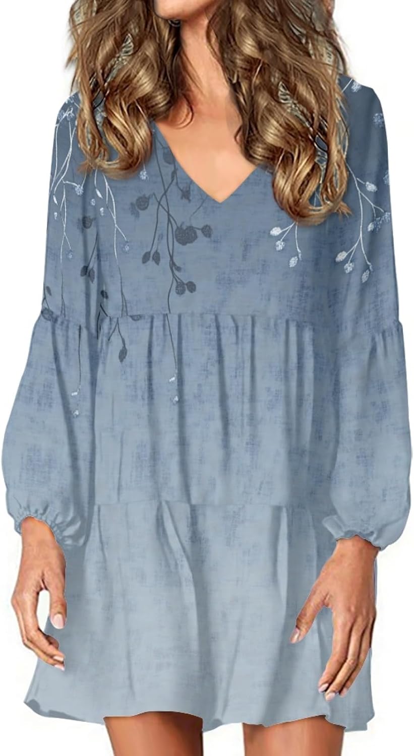 Floral Dress for Women Lantern Sleeve V Neck Plus Size Smocked Swing Flowy Ruffle Fashion Casual Holiday Midi Dress