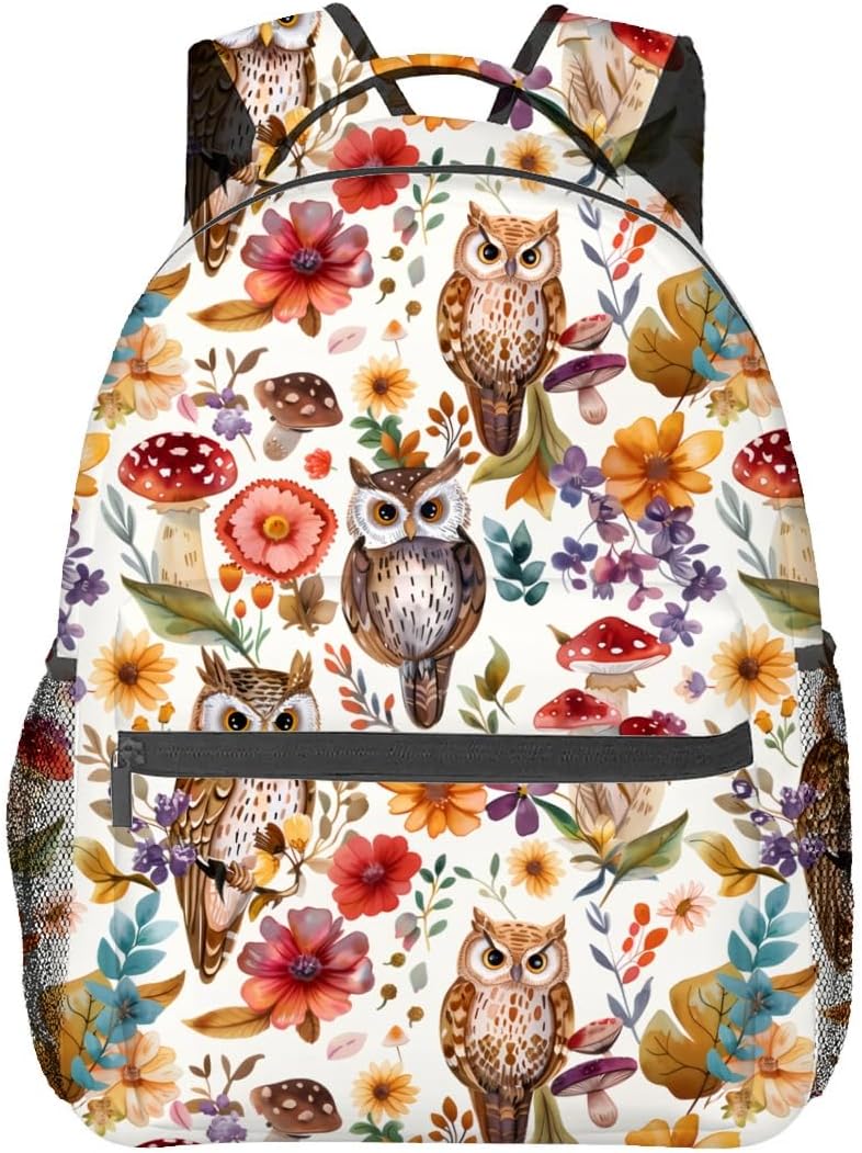 Adorable Owl & Mushroom Backpack, Travel School Laptop Polyester Cute Bird Backpacks for Women Kids, Work Sports Back Pack Casual Daypack, Lightweight Rucksack Gifts for Hiking Camping Gym