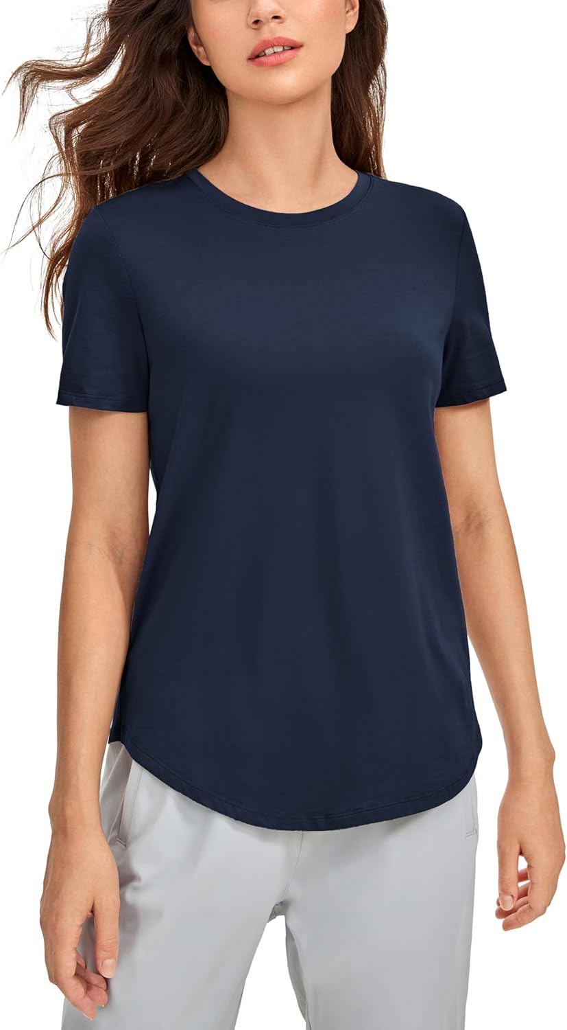CRZ YOGA Pima Cotton Crewneck T-Shirts for Women - Workout Casual Yoga Athletic Short Sleeve Shirts Soft Crewneck Hip Tops