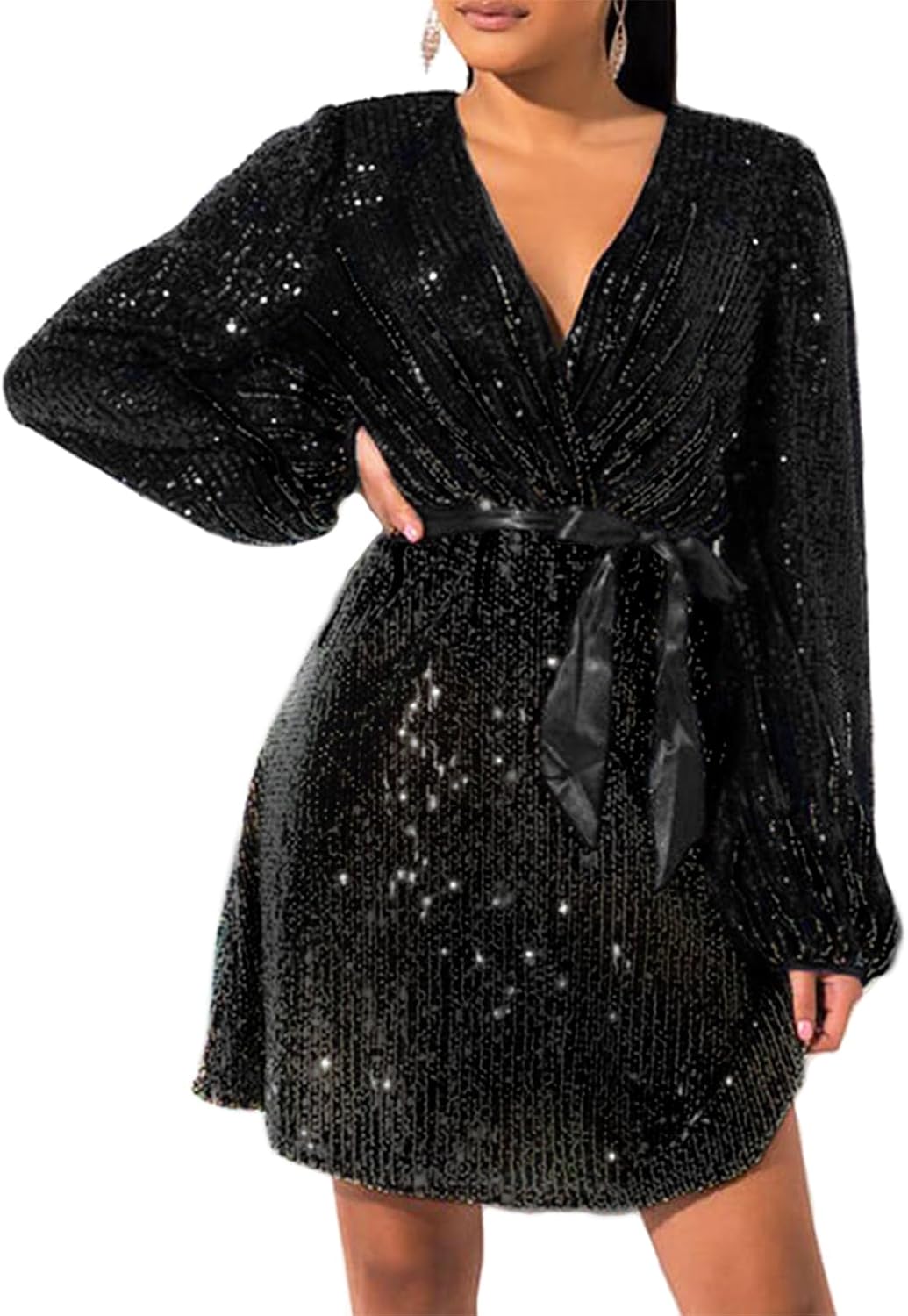 828 - Plus Size Long Sleeves Wrapped V Neck Sequins Skater Style Cocktail Evening Club Dress