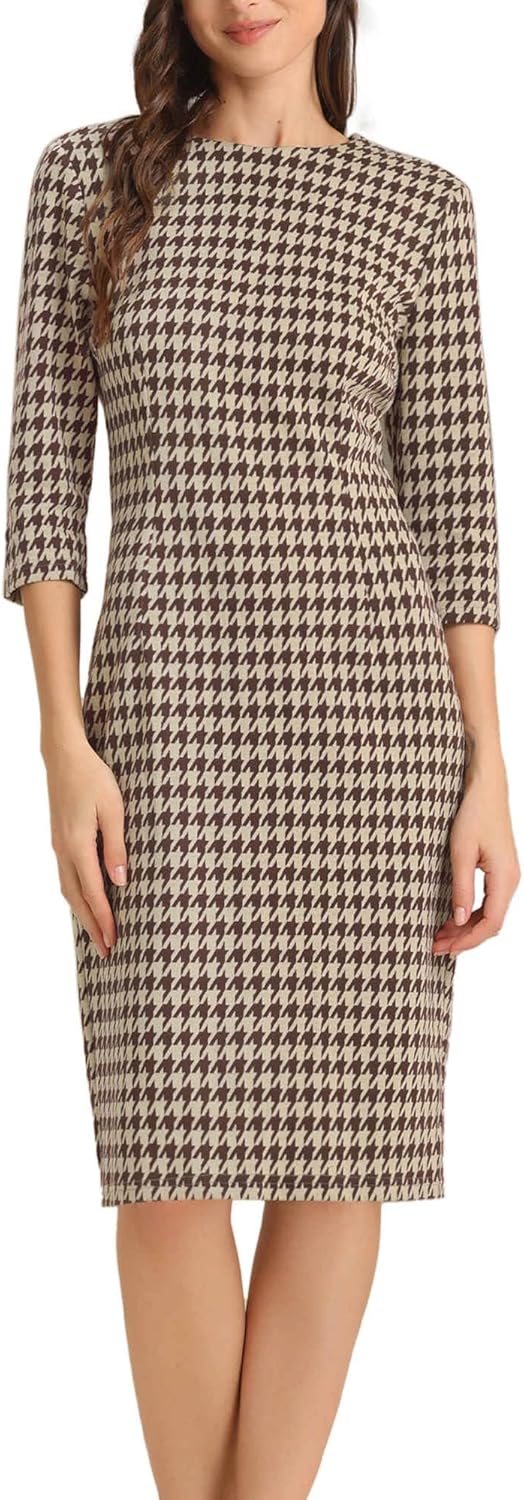 Allegra K Houndstooth Dress for Women Plaid 3/4 Sleeve Crew Neck Back Slit Keen Length Business Casual Elegant Sheath Dresses