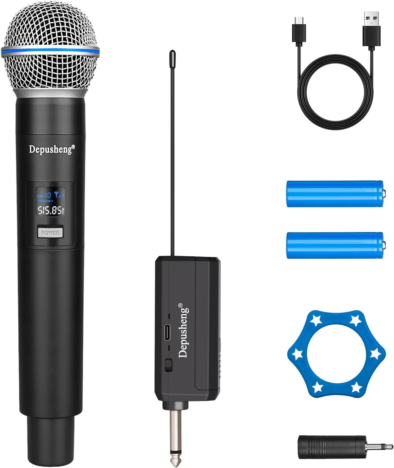 - 【What You Get】 :1 x handheld microphone, 1 x receiver with a 6.35mm plug, 1 x 3.5mm adapter, 1 x anti-slip ring, 1 x mic cover, 1 x USB charging cable, 1 x manual,2 x AA rechargeable batteries .