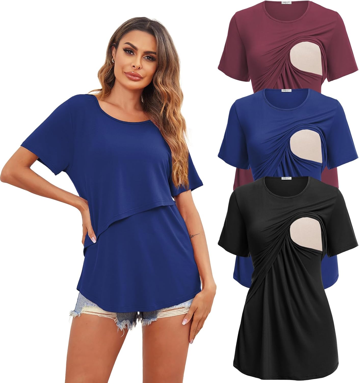 Ekouaer Women's Maternity Shirts Short Sleeves Nursing Tops 3 Pack Double Laye Breastfeeding Tees Pregnancy Clothes S-XXL