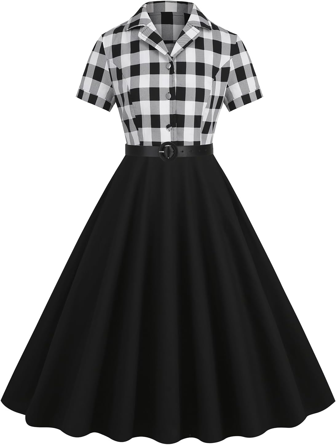 Women Short Sleeve 1950s Retro Vintage Cocktail Party Swing Dress Polka Dot Audrey Dress Casual A-Line Work Dress with Belt