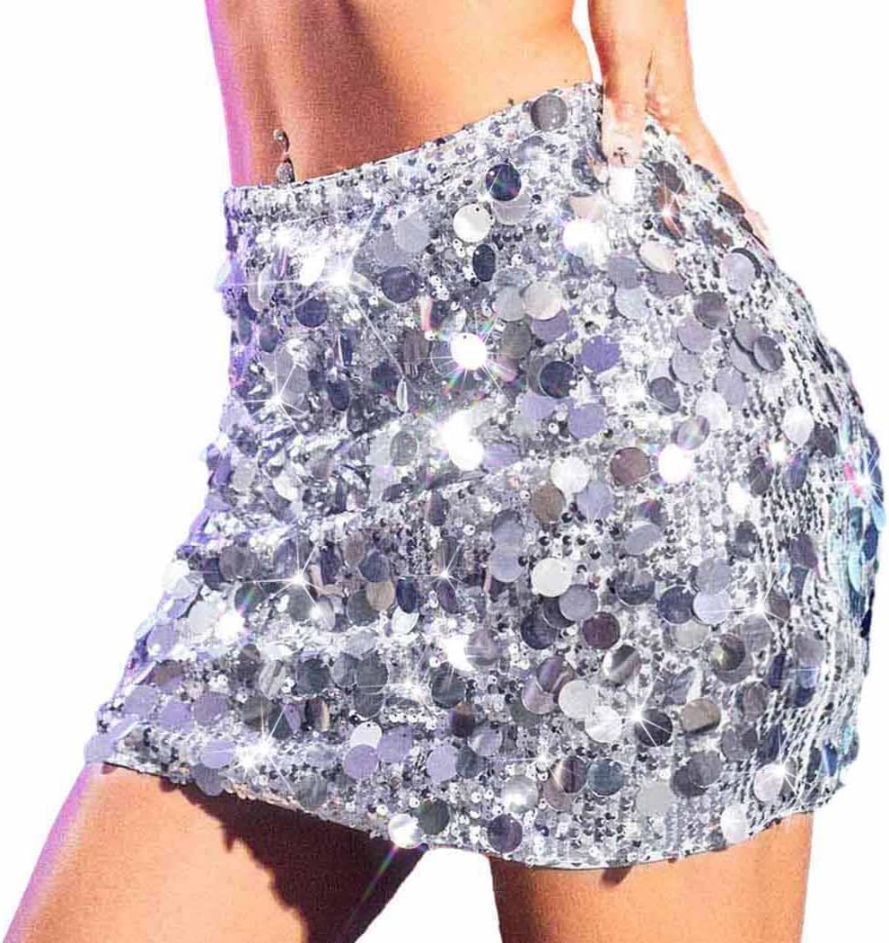 TWINKLEDE Silver Sparkly Sequin Skirt Glitter Rave Mini Skirt for Women