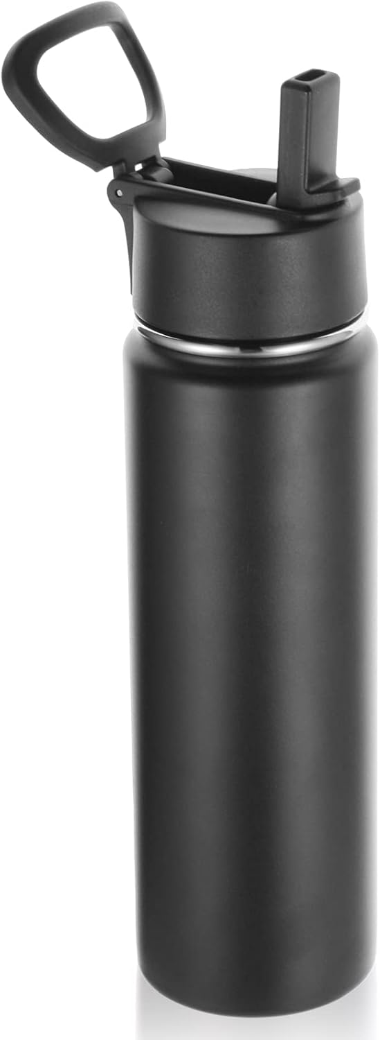 Volhoply 22 oz Insulated Water Bottles with Straw Lid, Stainless Steel Sports Bottle with Handle, Double Walled Metal Travel Water Cups with Wide Mouth, Reusable Water Flask for School(Black,1 Set)