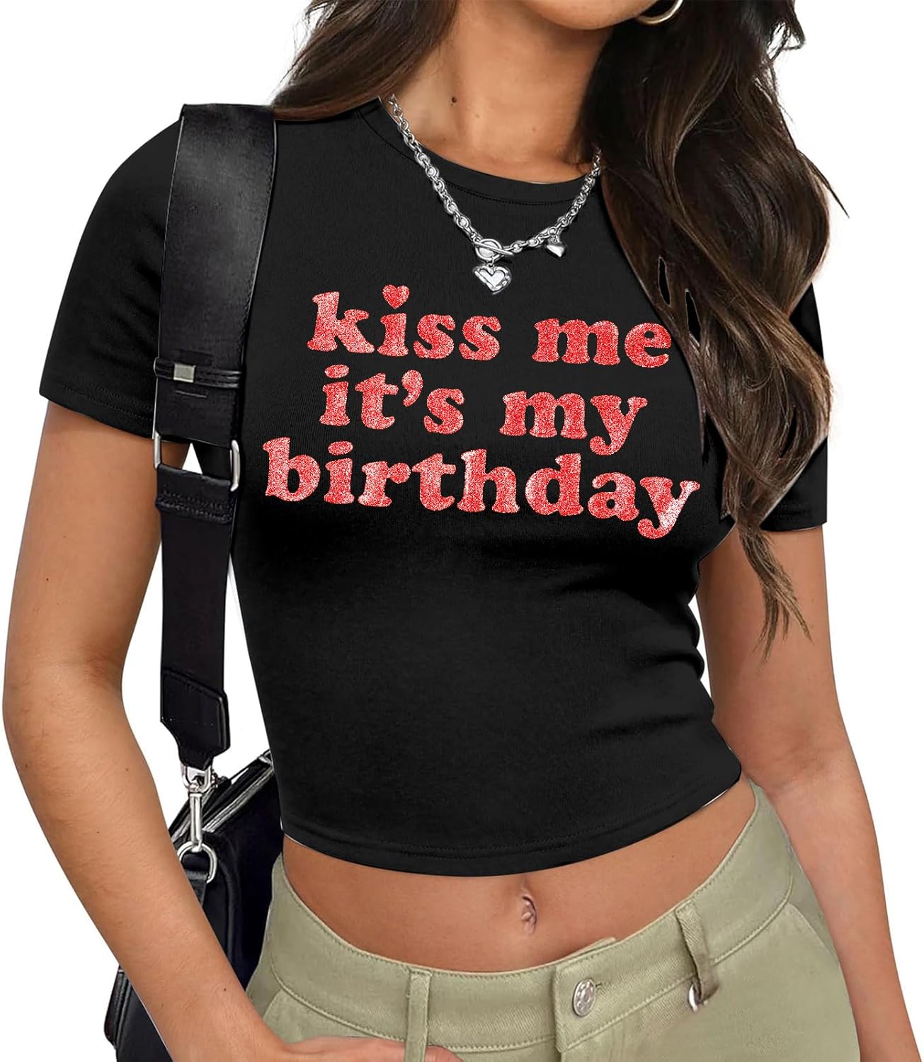 Birthday Shirts for Women Kiss Me Its My Birthday Shirt Crop Top Glitter Graphic Birthday Squad Shirts Birthday Party Tops