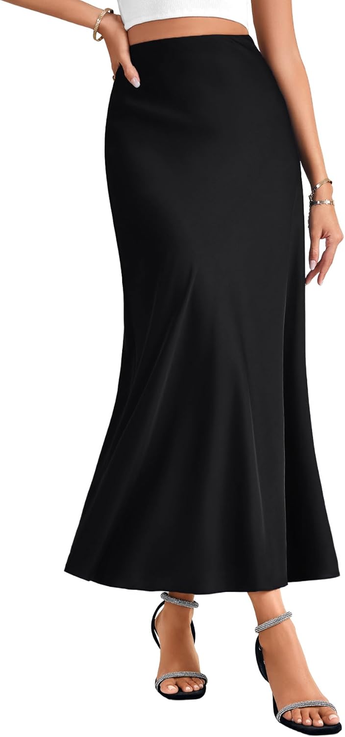 Rooscier Women's Satin High Elastic Waist Bodycon A Line Ruffle Side Zipper Elegant Maxi Skirt
