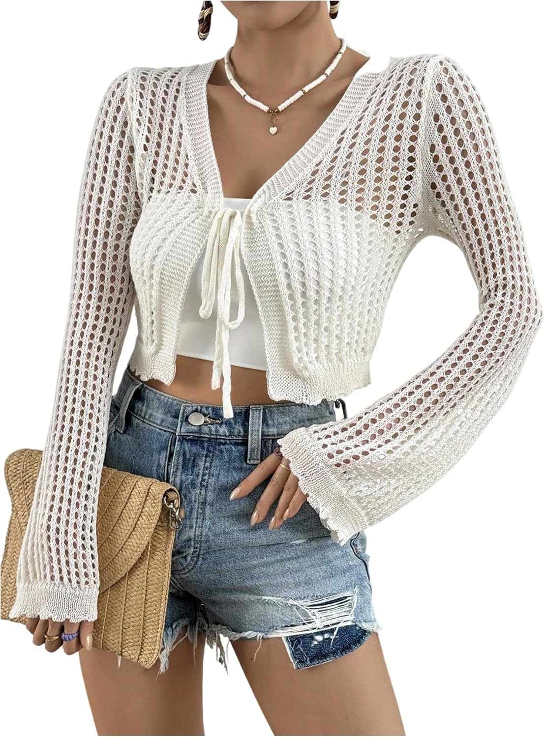 OYOANGLE Women's Crochet Tie Front Crop Cardigan Hollow Out Shrug Long Sleeve Knit Top
