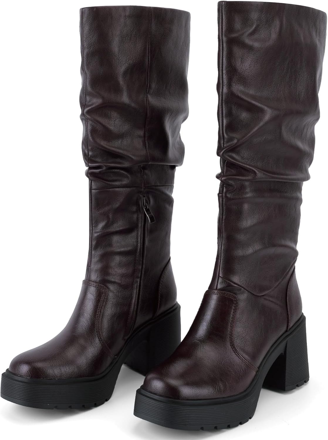 UBWDU Women's Platform Campus Knee High Boots Side Zipper Chunky Block heel Tall Boots Square Toe Long Leather Booties