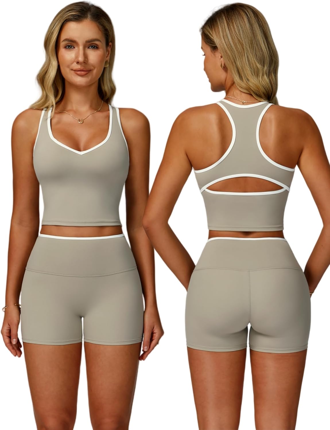 ABOCIW Workout Sets for Women 2 Piece Color Block V Neck Racerback Tank Top Built in Bra High Waist Shorts