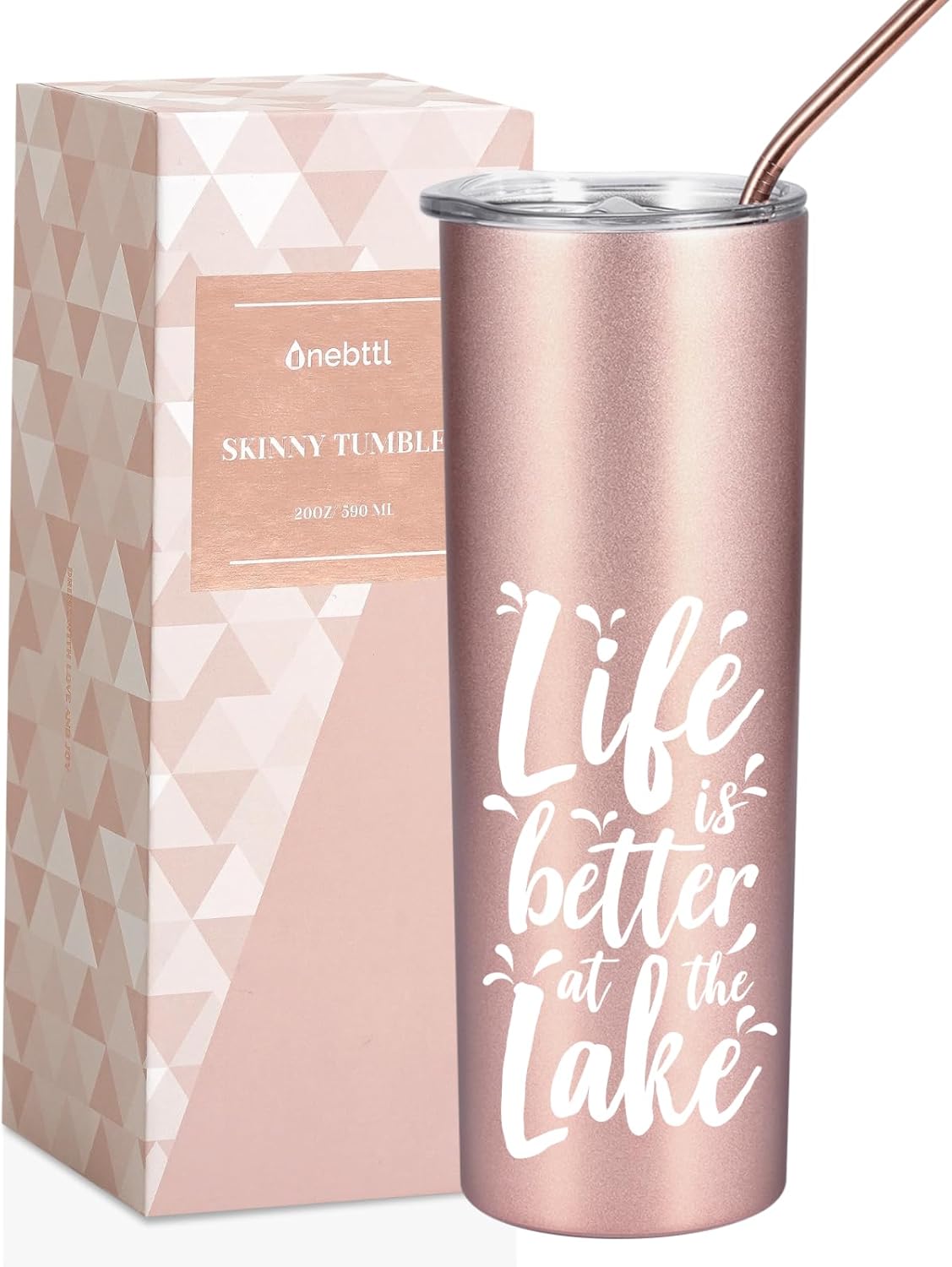 Onebttl Lake House Gifts for Women, 20oz Stainless Steel Insulated Tumbler, Housewarming Gifts for Lake Lovers - Rose Gold, Life is Better at the Lake 01