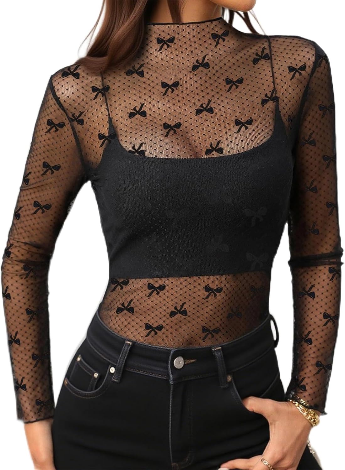 Pasgreson Women's Sexy long sleeve Bodysuit See Through Tops Party Night Out Club Outfits Slim Leotard Body Suits