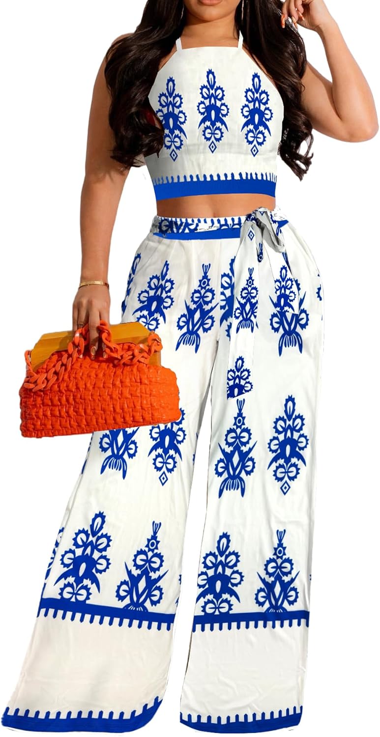 Elegant 2 Piece Sets for Women Sexy Printing Crop Top Long Straight Pants Vacation Outfits Beach