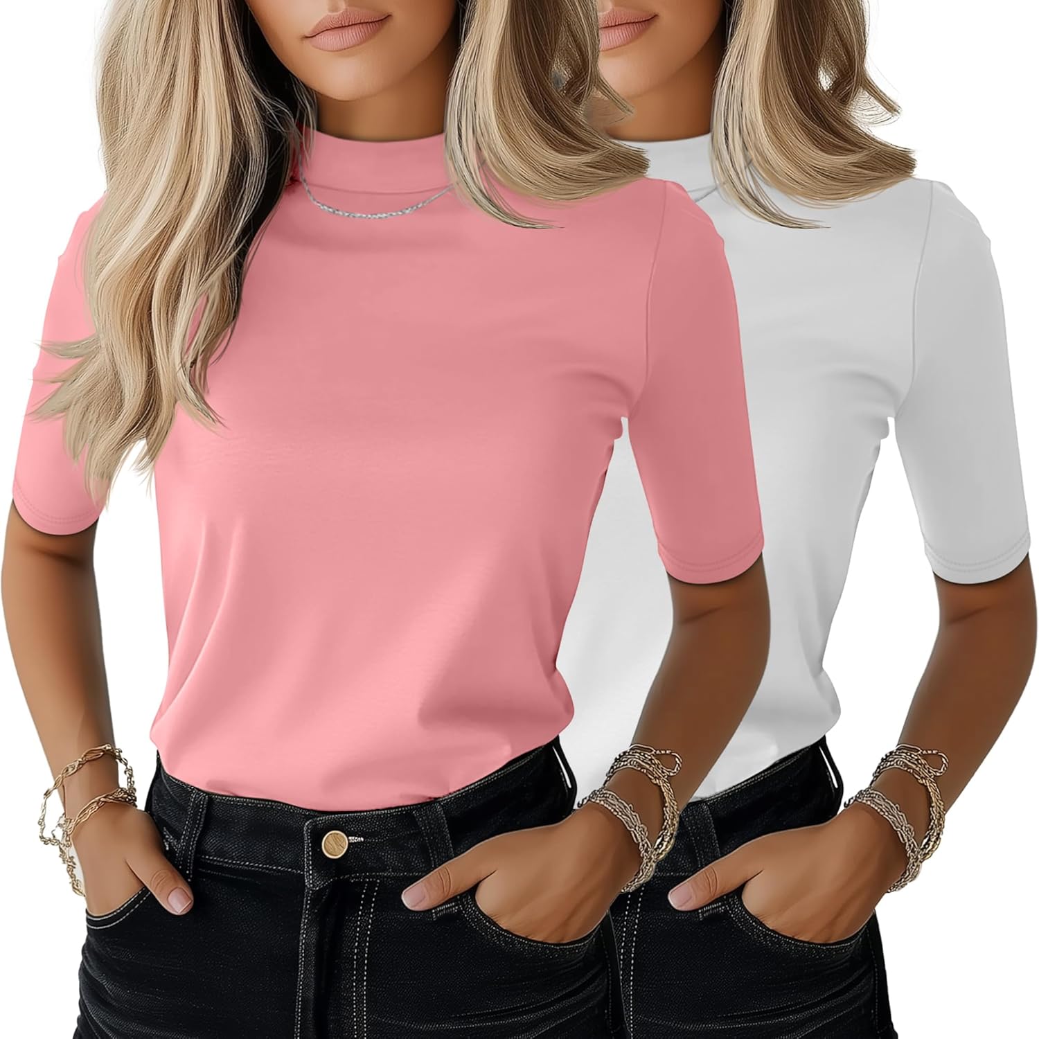 Ficerd 2 Pack Women's Mock Turtleneck T Shirts, Half Sleeve Business Casual Tunic Tops Slim Fit Summer Basic Dressy Tee Shirt
