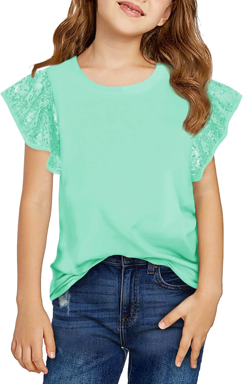 Haloumoning Girls Ruffle Short Sleeve T Shirts Sequin Casual Cute Crewneck Tops Blouses 5-14Y