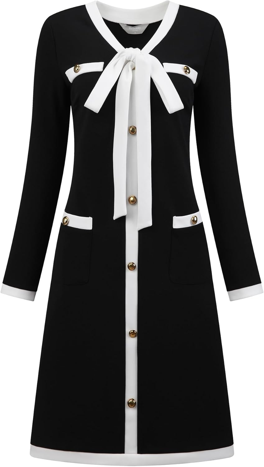 Women's Elegant A-Line Dress Contrast Color V Neck Long Sleeve 2025 Trendy Work Dresses