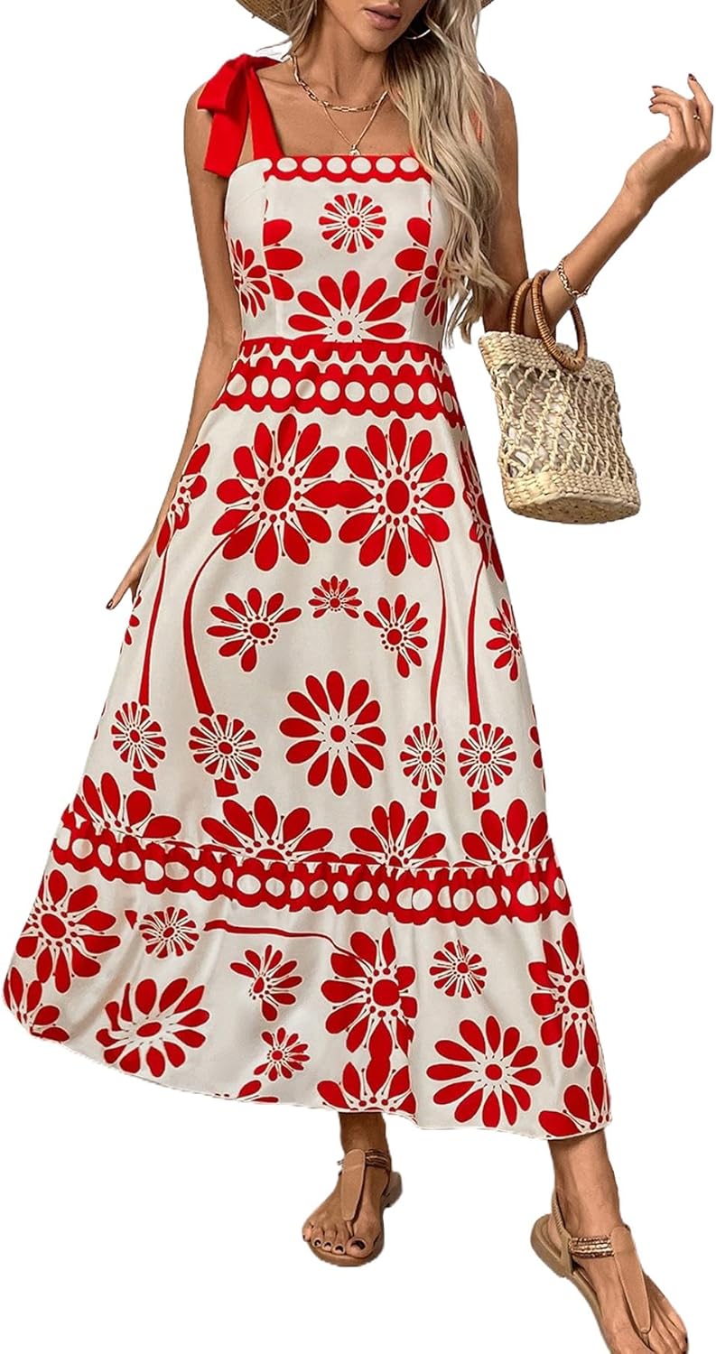 Women's Floral Print Maxi Dress - Adjustable Tie-Shoulder, Lightweight Beach & Summer