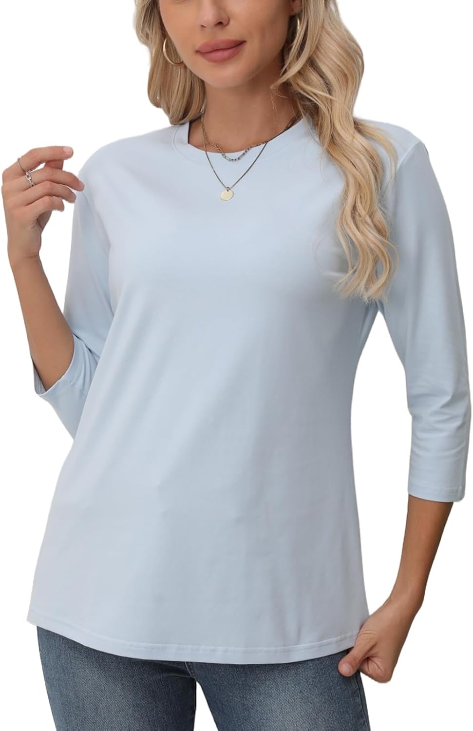 ALUS 3/4 Length Sleeve Tops for Women Crew Neck Casual Blouses Basic T Shirts