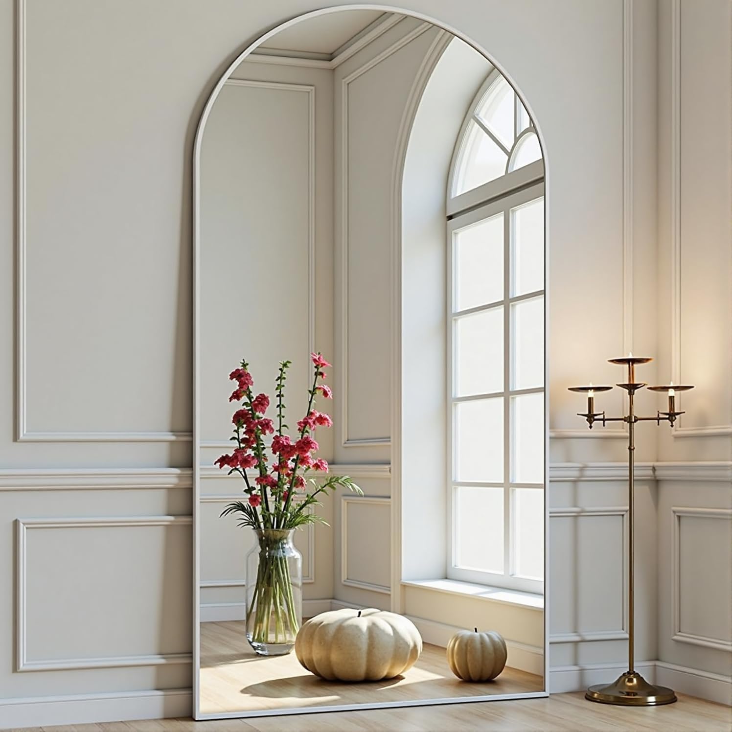 Full Length Mirror, 71"x30" Arched-Top Floor Mirrors, Modern Full Body Mirrors with Stand, Wall Mirror with Aluminum Alloy Frame for Bedroom,Living Room, White