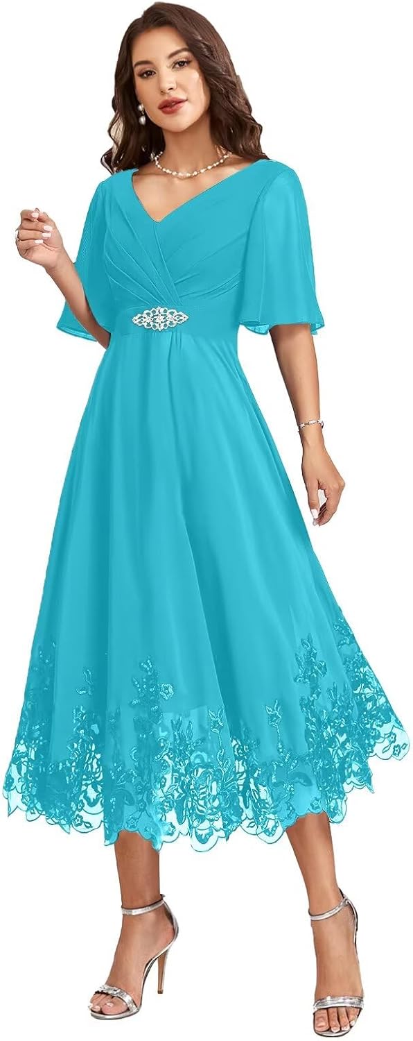 Women Tea Length Chiffon Mother of The Bride Dresses for Wedding V Neck Grandmother Groom Dress with 1/2 Sleeves