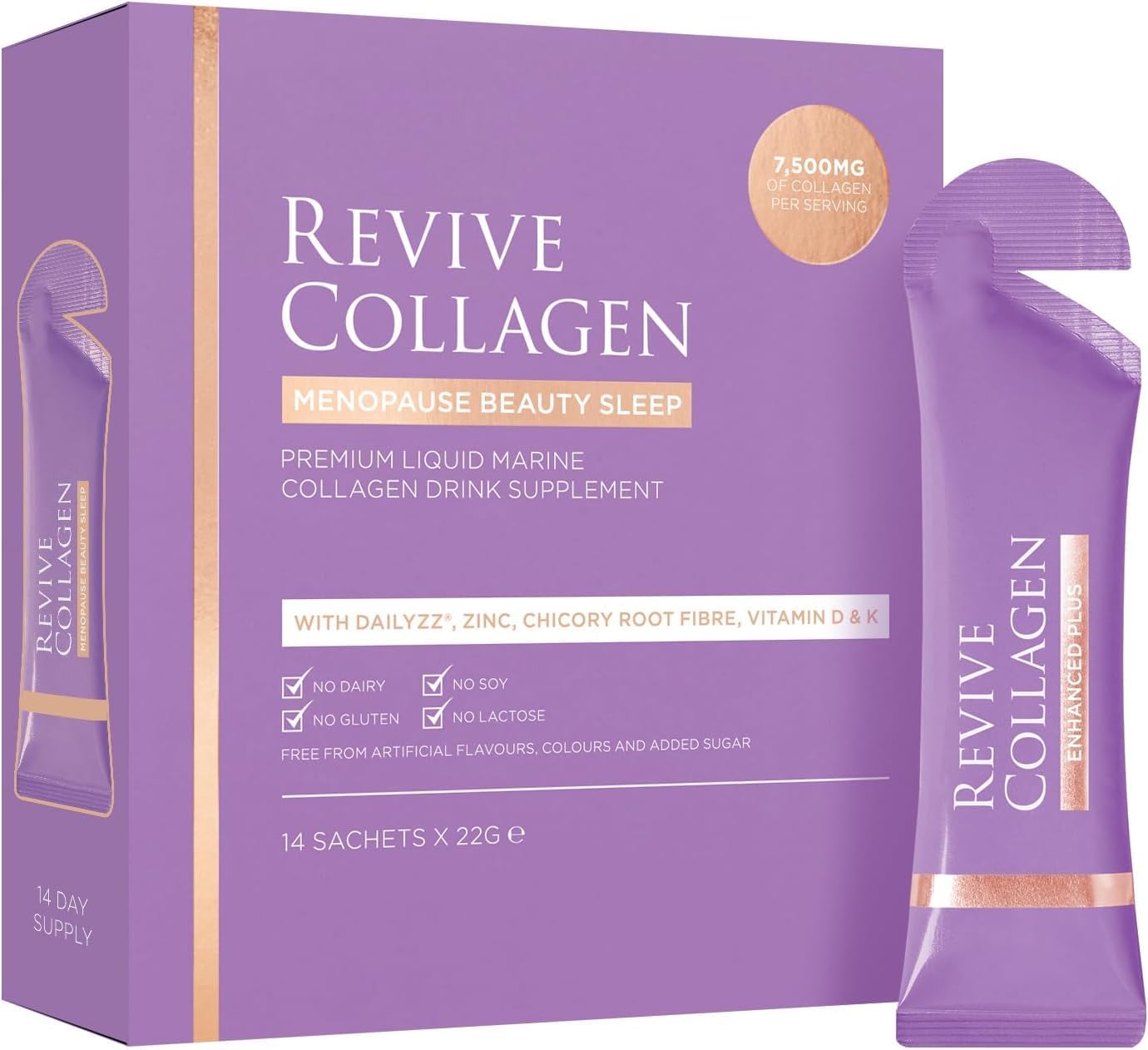 Revive Collagen Menopause Beauty Sleep — Hydrolyzed Marine Collagen Drink for Women, 7,500MG, Zinc, Chicory Root Fiber, Vitamin D & K, Supports Sleep Quality, Apple & Blackcurrant Flavour — 14 Sachets