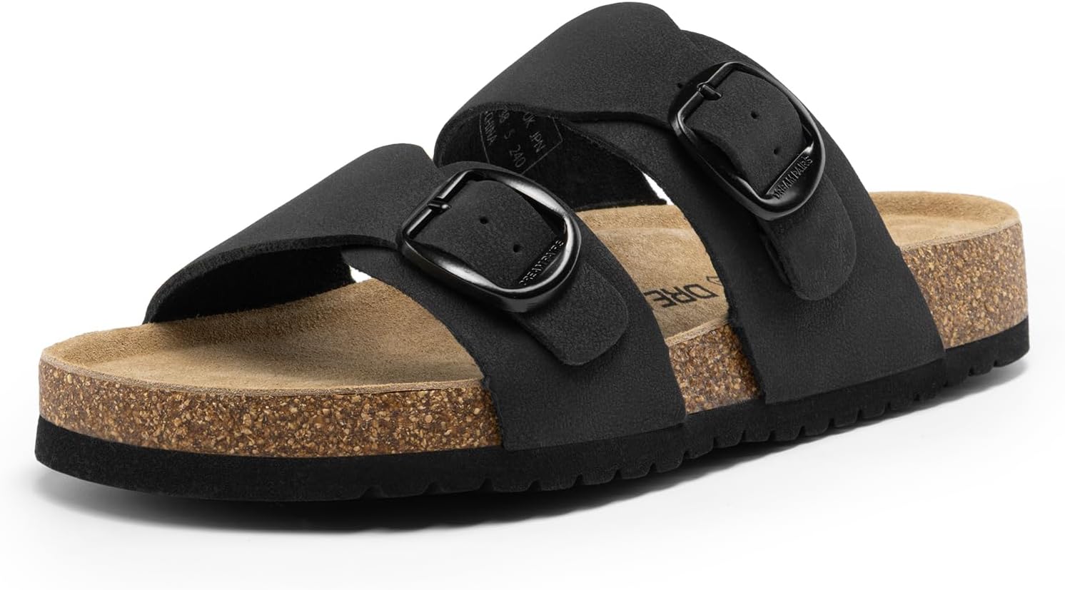 DREAM PAIRS Women's Slides Soft Genuine Footbed Sandals Comfortable Adjustable Double Buckle Slip-on Flat Sandals with Arch Support Frame Dual Slippers for Summer Footwear